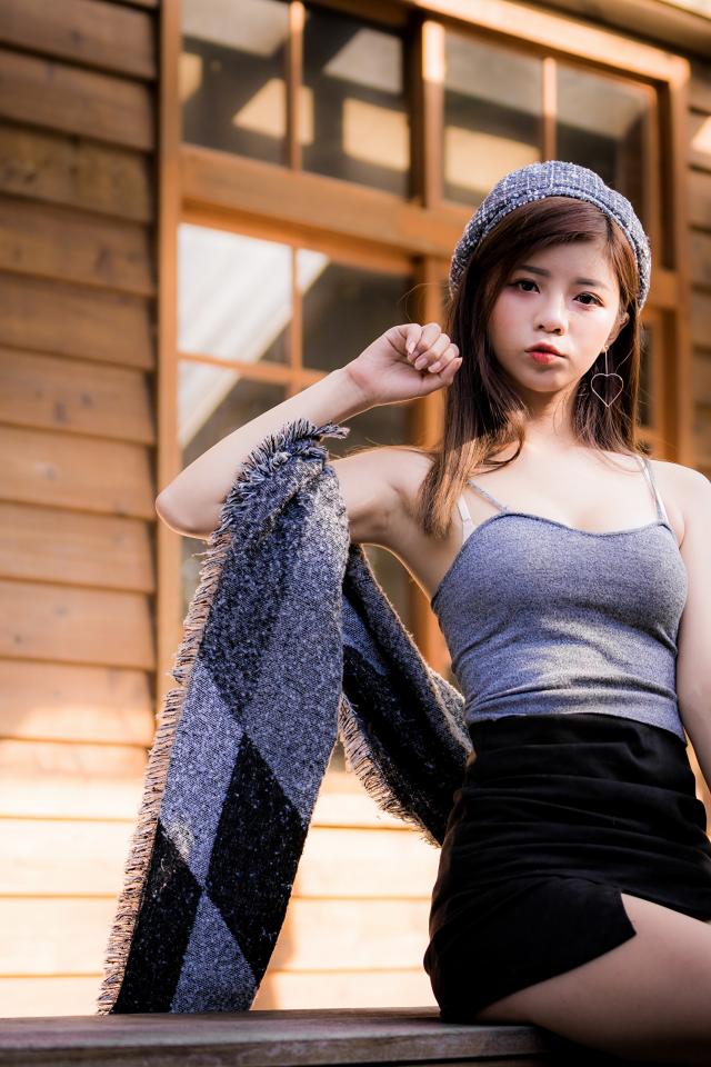 Wallpaper Young Asian girl in a short skirt sits on a windowsill