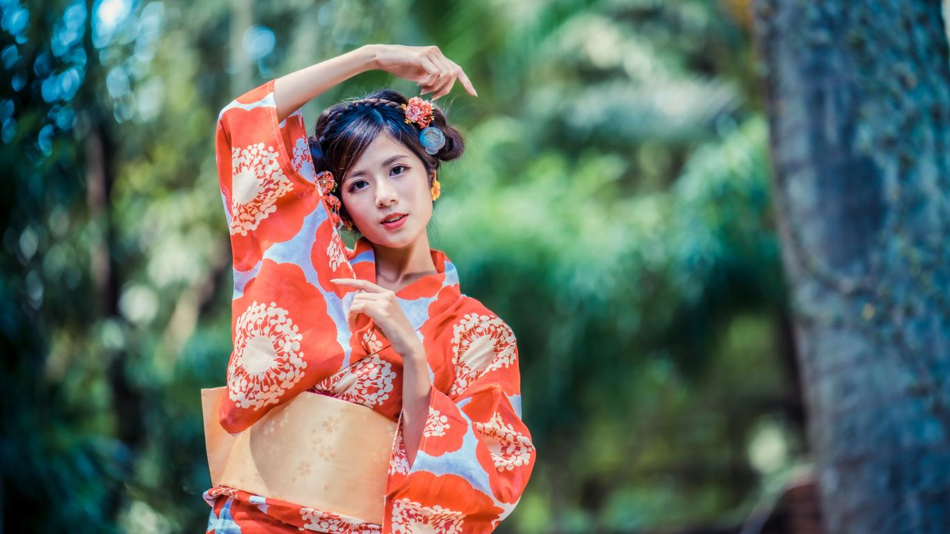 Wallpaper Young Asian girl in a kimono with flowers in her hair