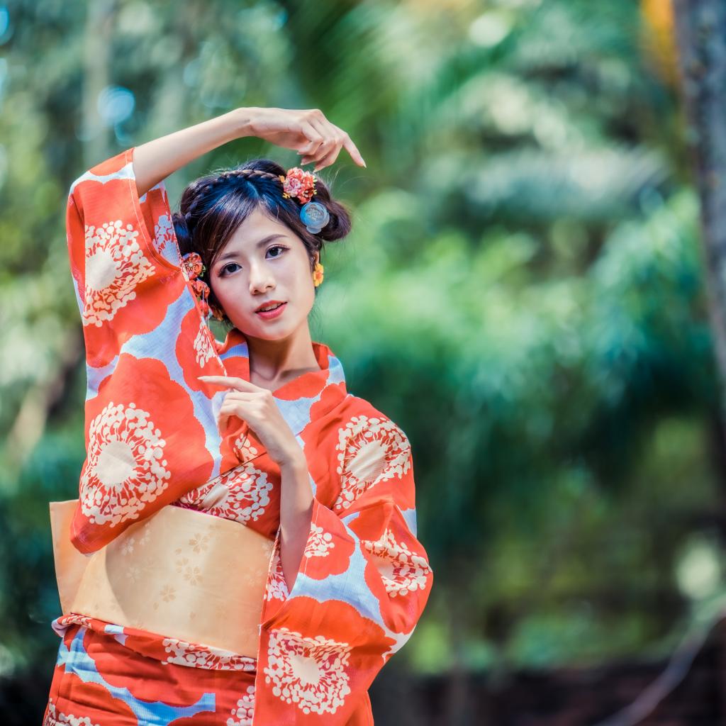 Wallpaper Beautiful Asian in multi-colored kimono in the park