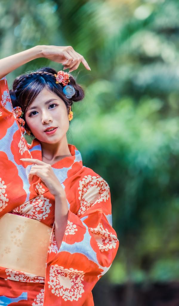 Wallpaper Young Asian girl in a kimono with flowers in her hair