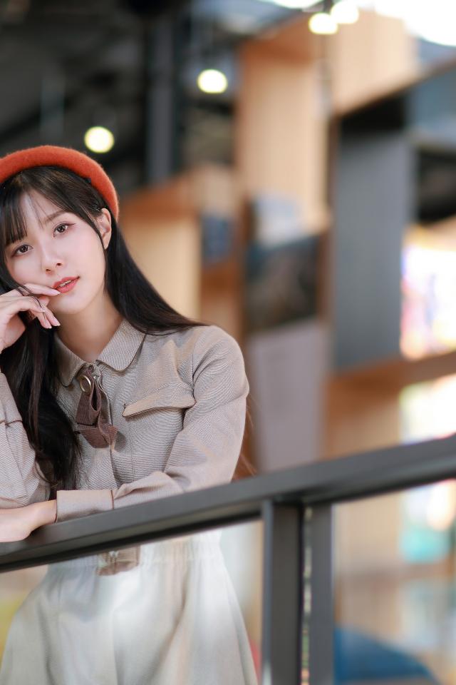 Wallpaper Asian woman in a gray dress stands at the railing