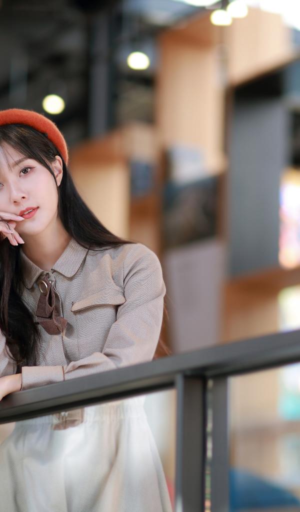 Wallpaper Asian woman in a gray dress stands at the railing