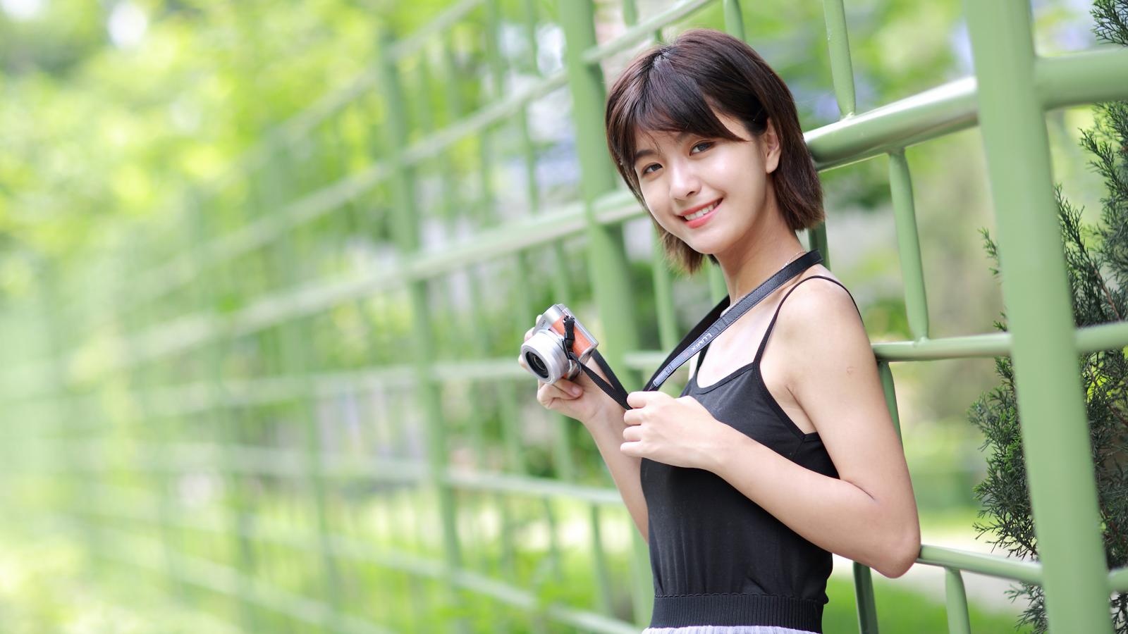 Wallpaper Young smiling asian with a camera at the fence