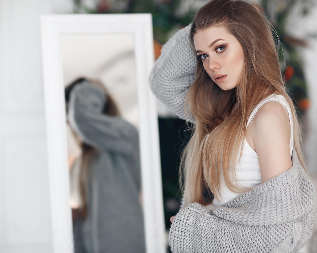 Wallpaper A young girl in a gray sweater stands at the mirror