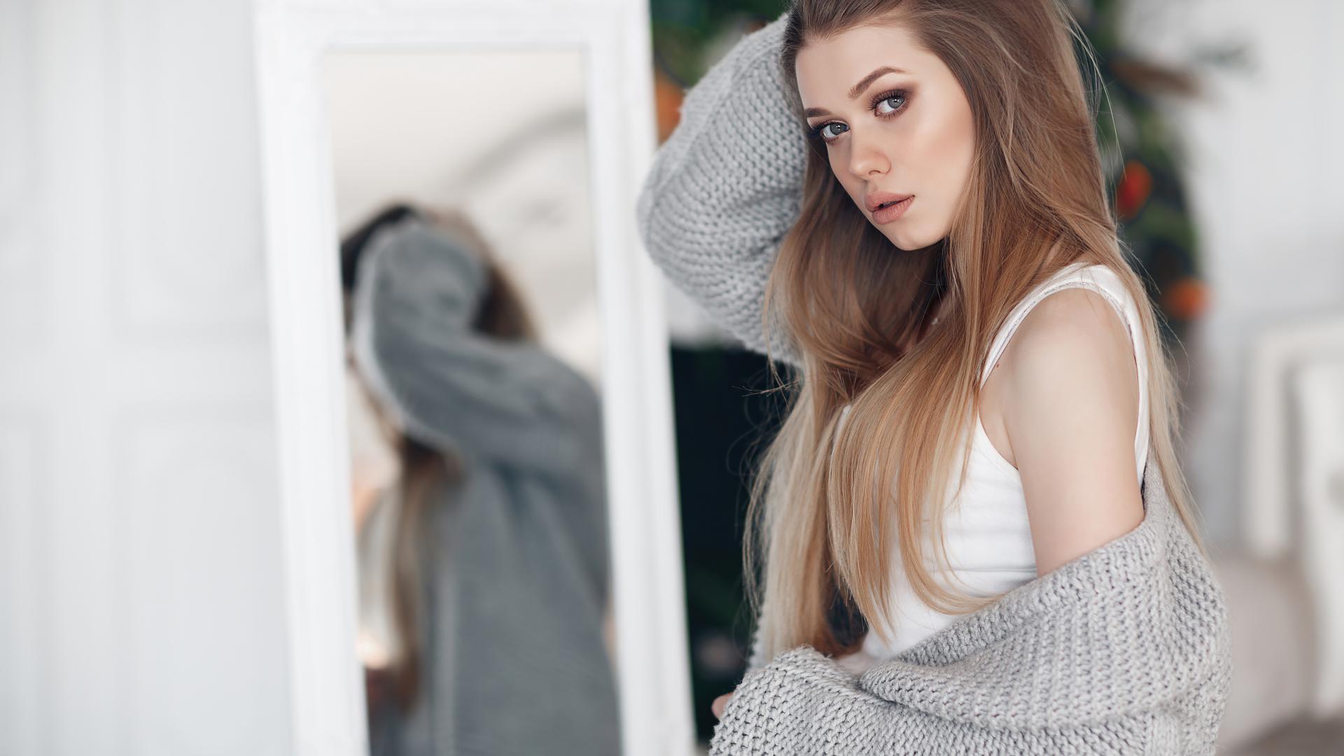 Wallpaper A young girl in a gray sweater stands at the mirror