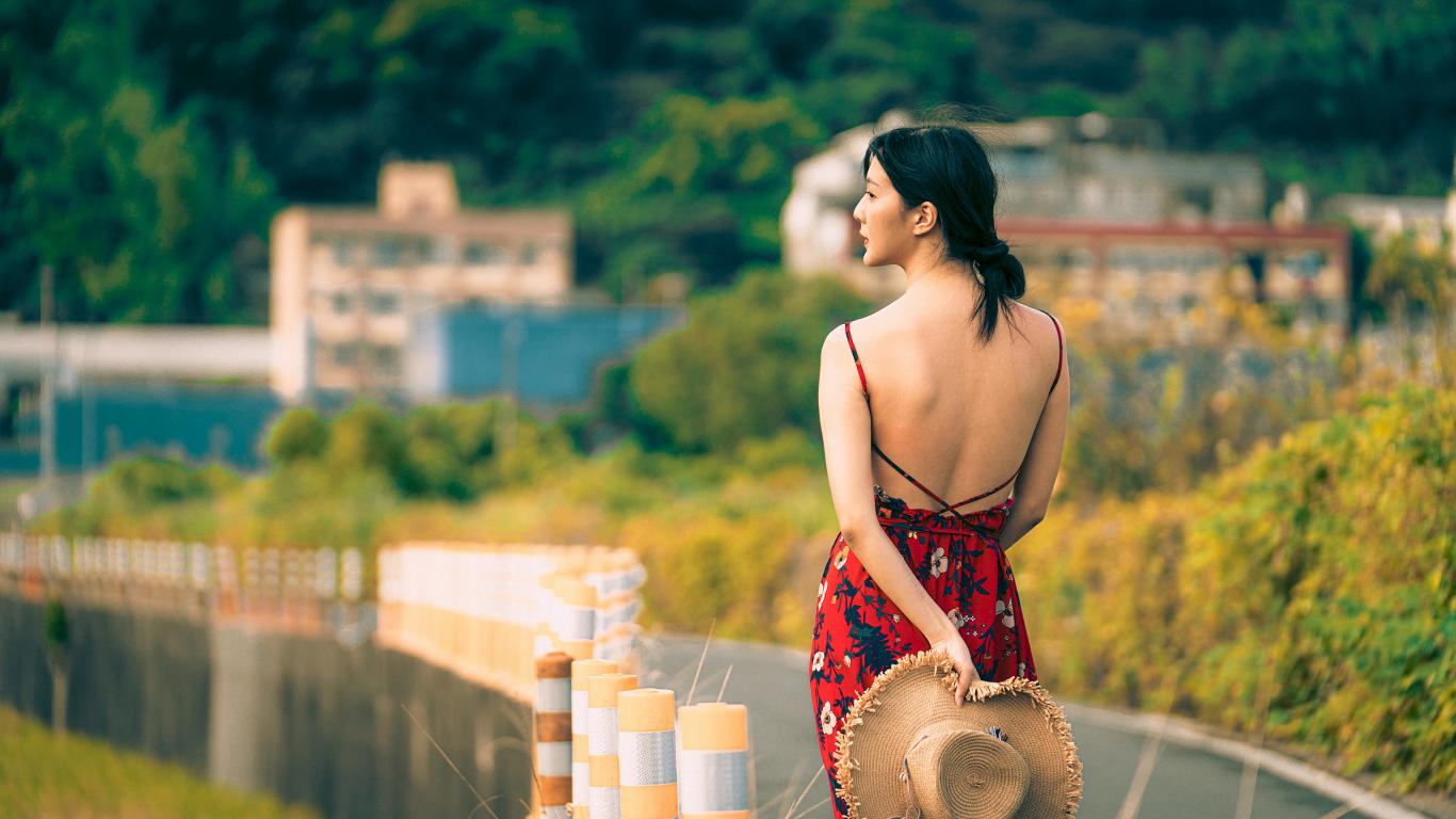 Wallpaper Young Asian girl in a sarafan with a hat in his hand