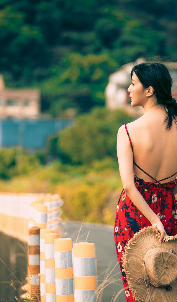 Wallpaper Young Asian girl in a sarafan with a hat in his hand