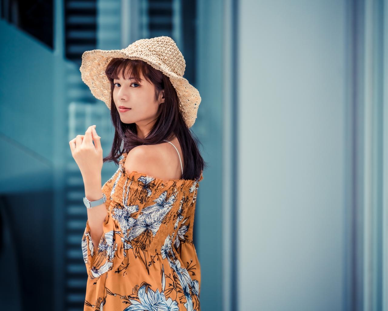 Wallpaper Asian girl in summer hat