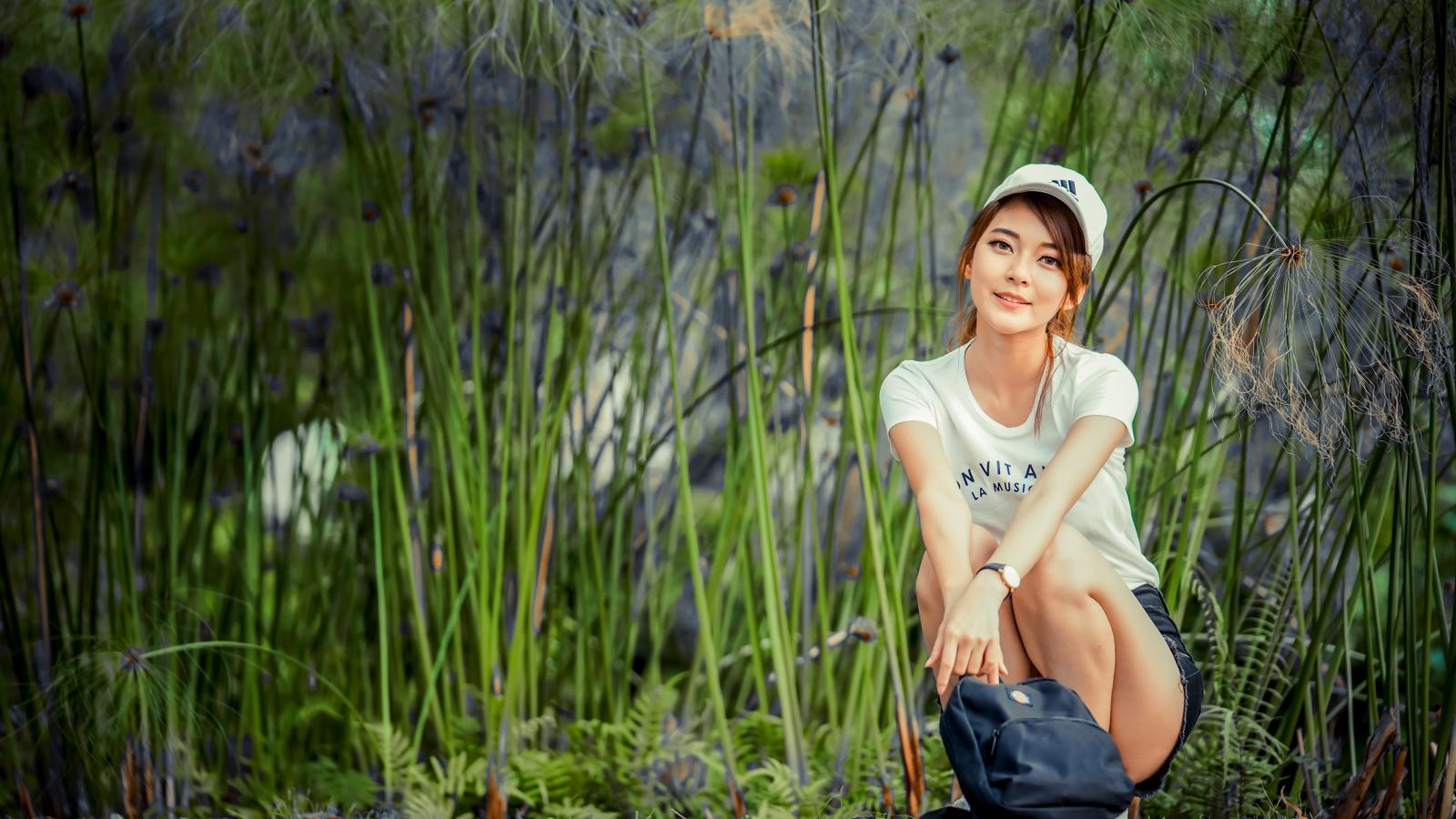 Wallpaper Cute girl in a cap sits on the road with a backpack