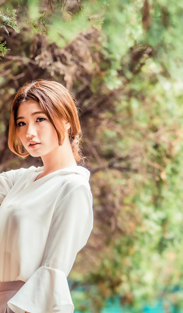 Wallpaper A young Asian woman in a white blouse stands by a tree