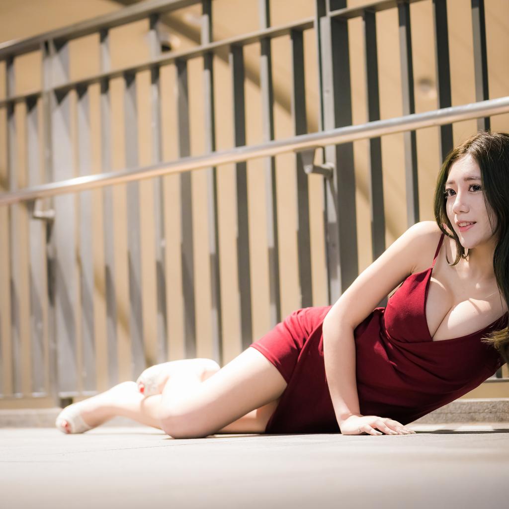 Wallpaper Cute Asian girl in a red dress lies on the ground