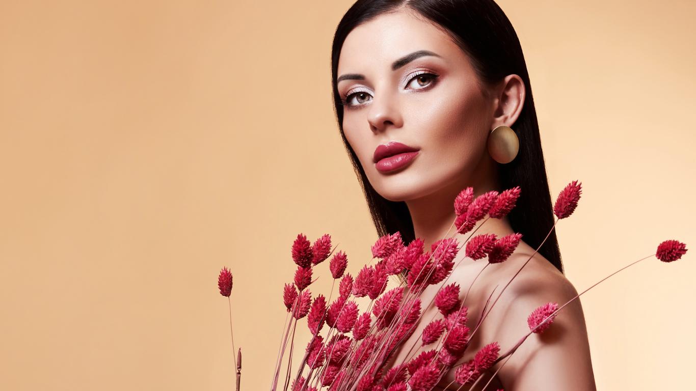 Wallpaper Beautiful brunette in a bouquet of red flowers