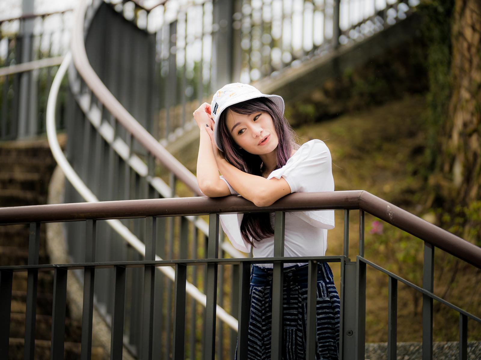 Wallpaper Beautiful Asian woman in panama stands at the railing