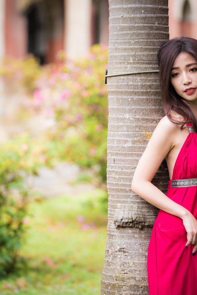 Wallpaper Slender Asian in a red dress by a tree