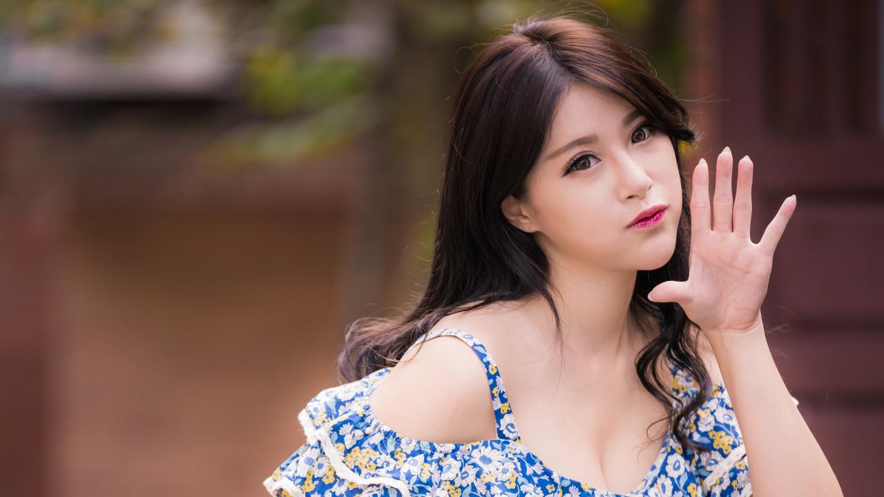 Wallpaper Young Asian girl in a sarafan with a hat in his hand
