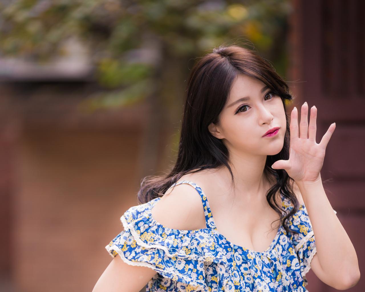 Wallpaper Young Asian girl in a sarafan with a hat in his hand