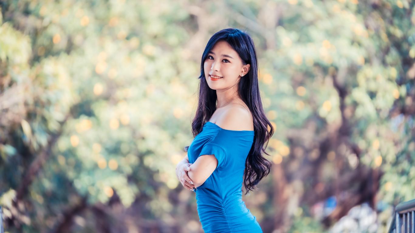 » Wallpaper Smiling Asian girl in a blue dress