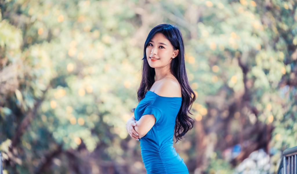 » Wallpaper Smiling Asian girl in a blue dress