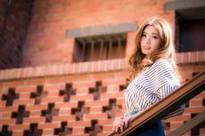 Wallpaper Cute brown-eyed girl in a striped T-shirt sits on a chair.