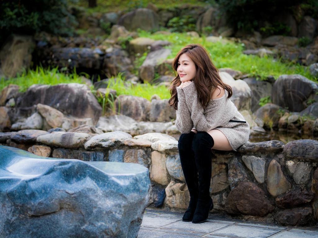 Wallpaper Beautiful girl in a jacket sits by the pond