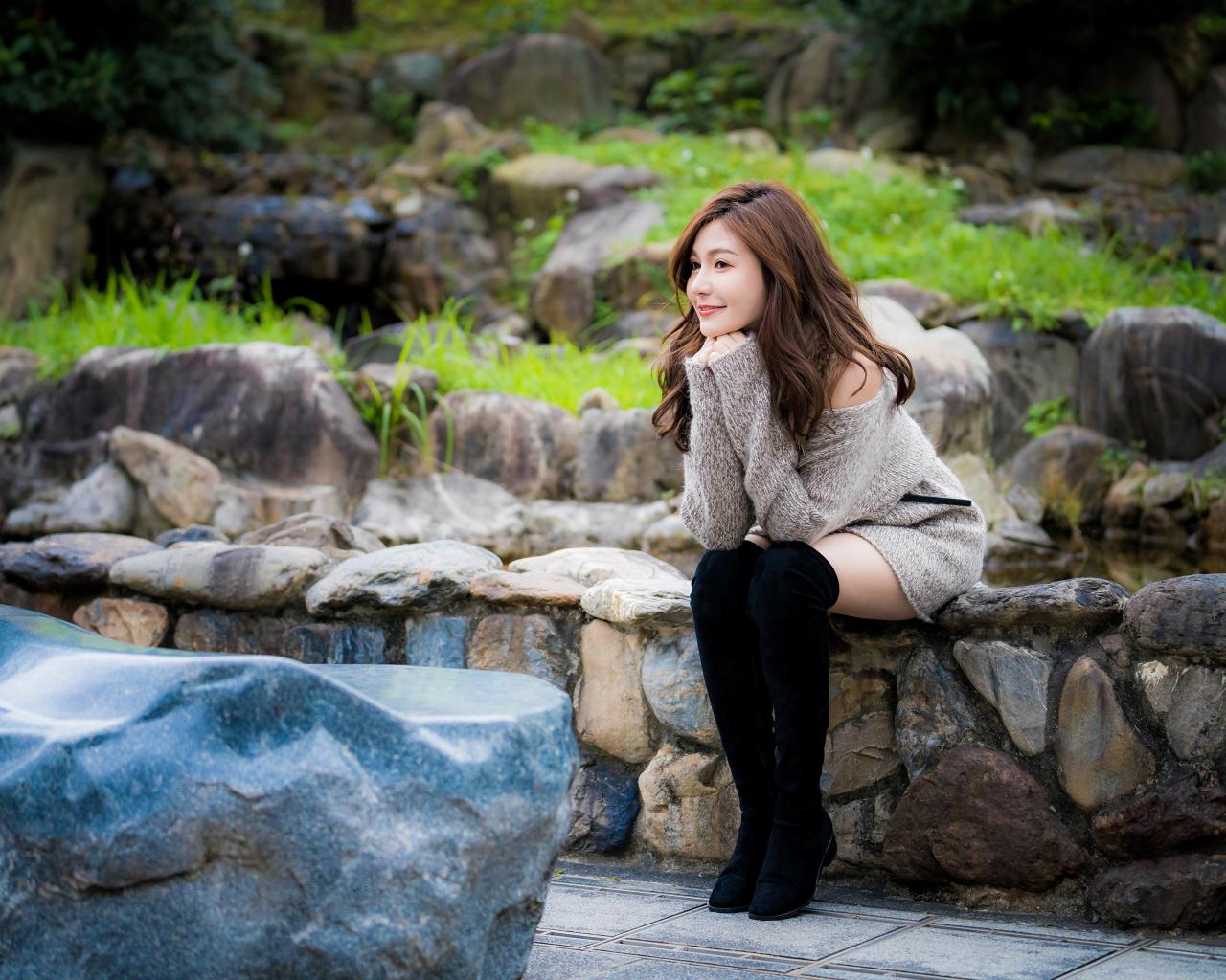 Wallpaper Beautiful girl in a jacket sits by the pond