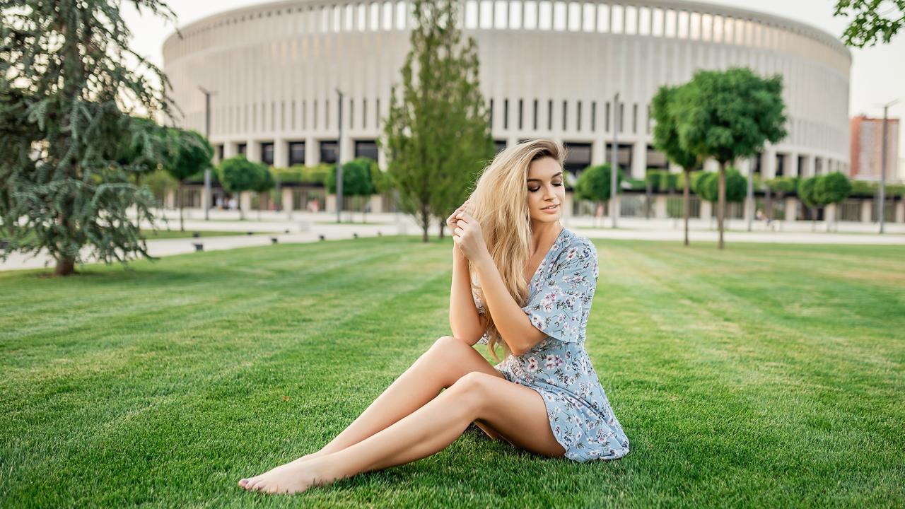 Wallpaper Beautiful girl in a dress sits on a green lawn