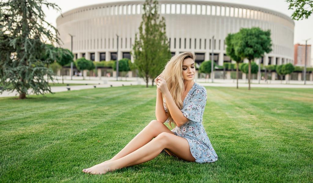 Wallpaper Beautiful girl in a dress sits on a green lawn