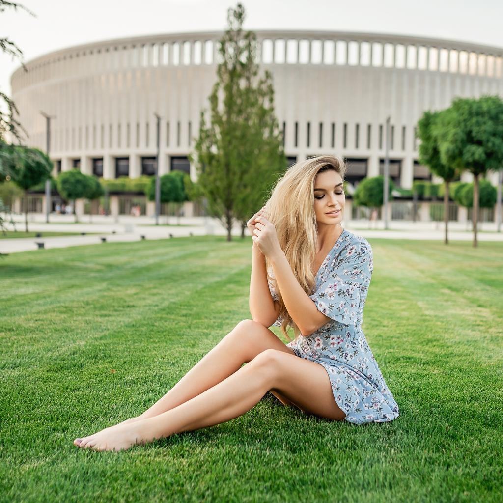 Wallpaper Beautiful girl in a dress sits on a green lawn