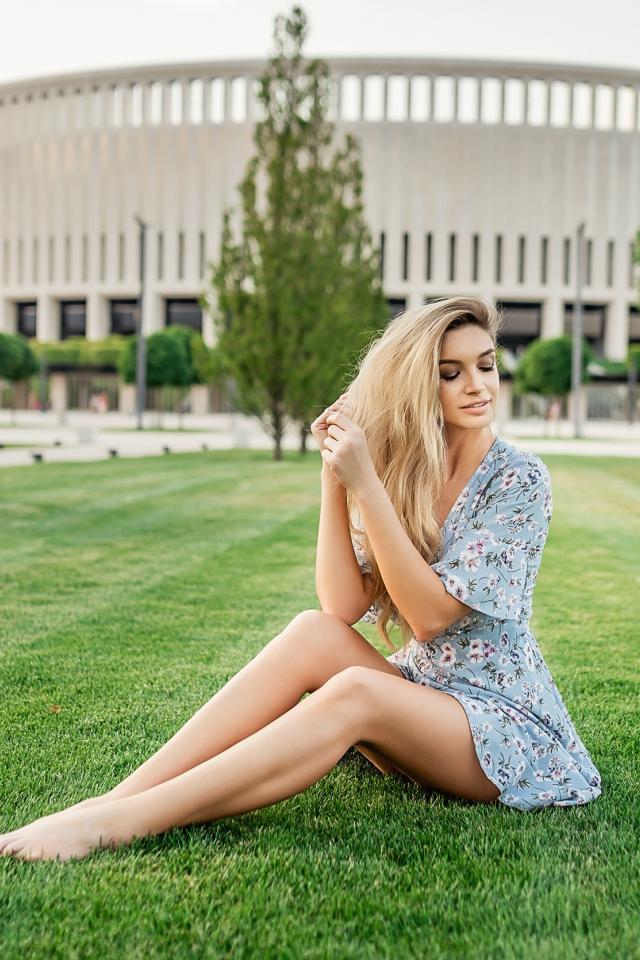 Wallpaper Beautiful girl in a dress sits on a green lawn