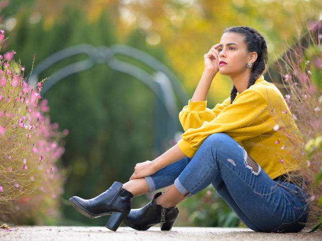 Wallpaper Young slender Asian woman sits on the ground in a park