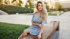 Wallpaper Beautiful smiling girl in a yellow dress sits on a bench