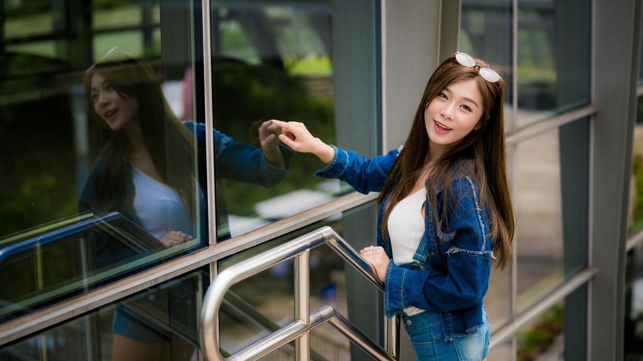 Wallpaper Smiling girl in a denim jacket stands by the wall