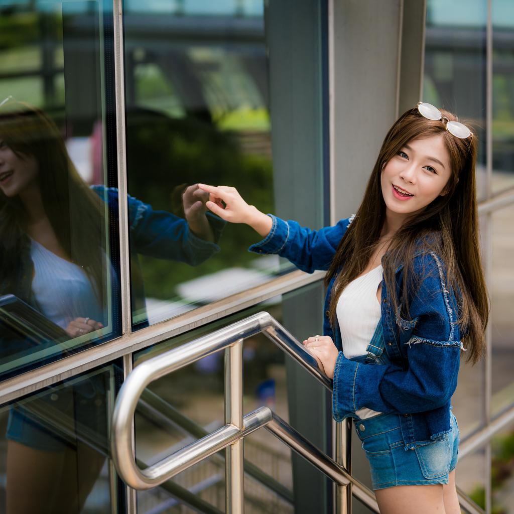 Wallpaper Smiling girl in a denim jacket stands by the wall