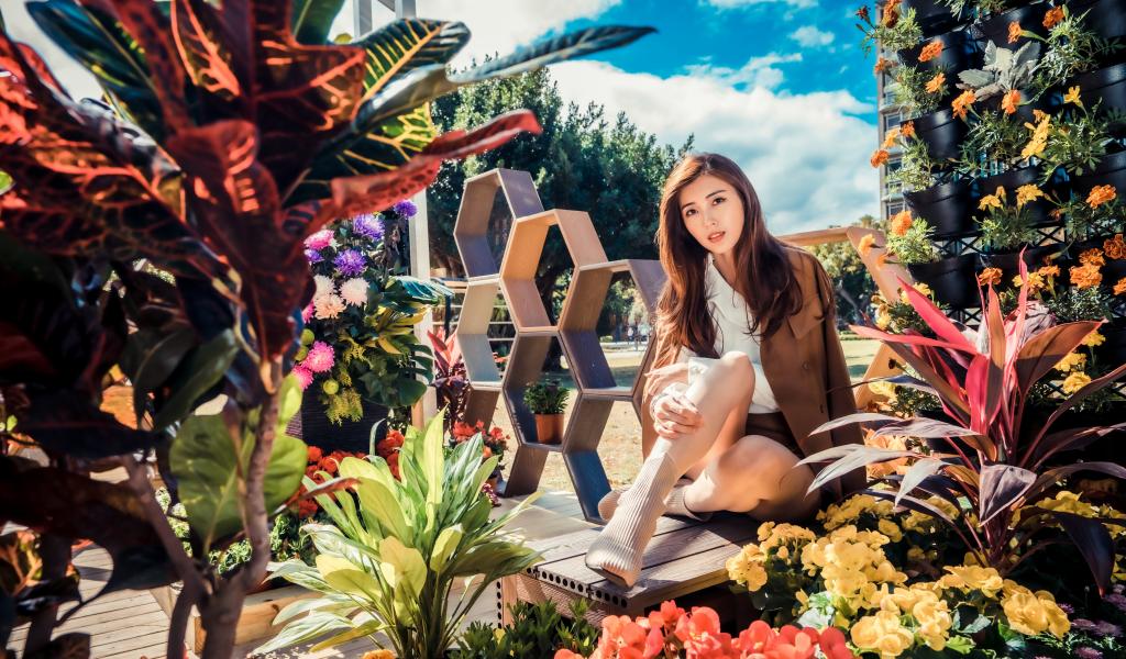 Wallpaper A young Asian woman sits near a flower bed