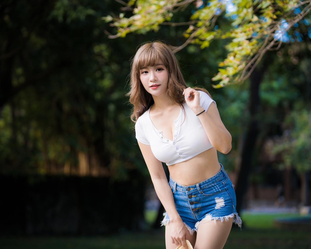 Wallpaper Young Asian in white top and blue shorts in a park