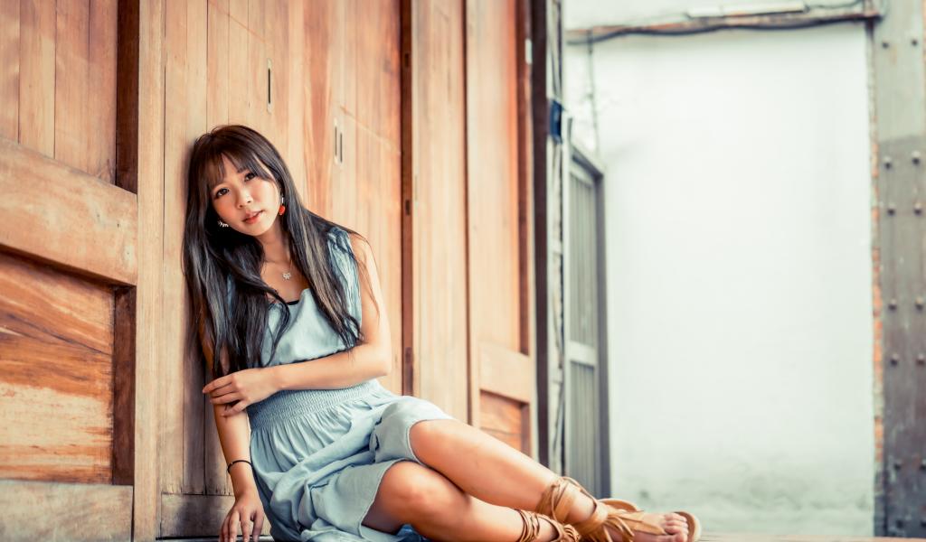 Wallpaper Asian girl in dress sits on the floor against the wall