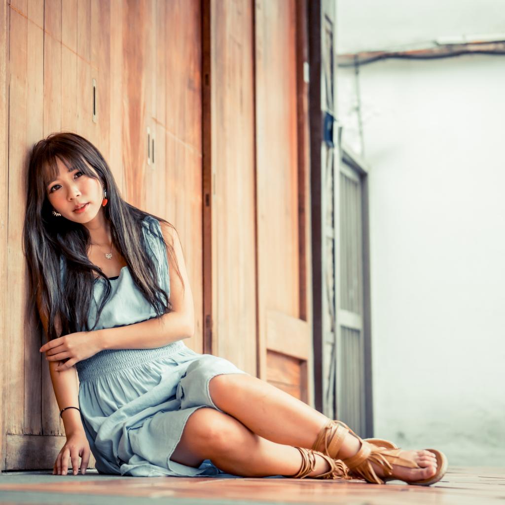 Wallpaper Asian girl in dress sits on the floor against the wall