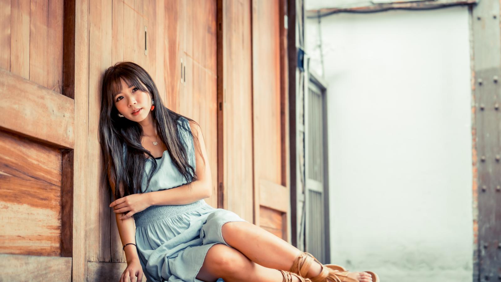 Wallpaper Asian girl in dress sits on the floor against the wall