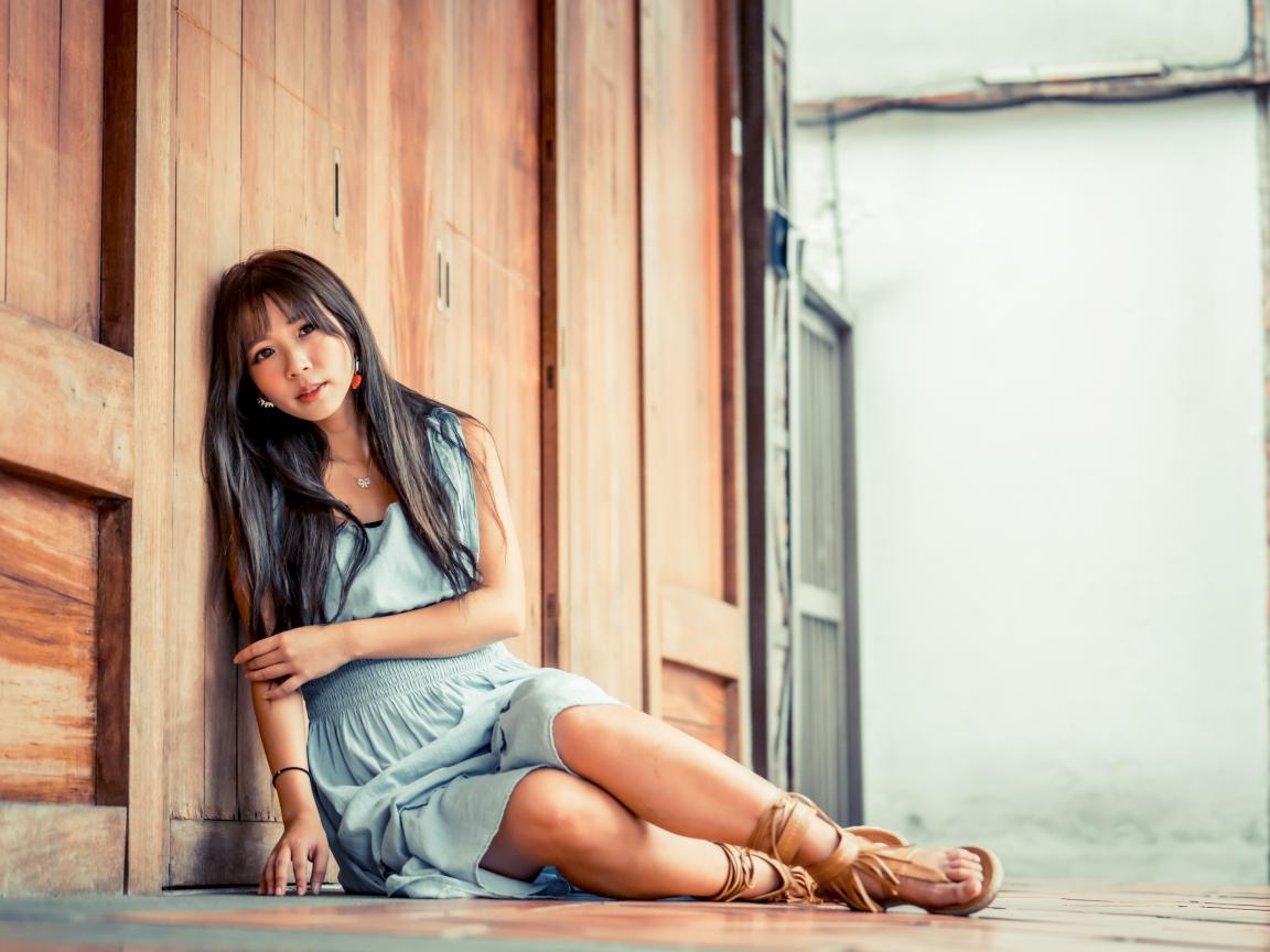 Wallpaper Asian girl in dress sits on the floor against the wall