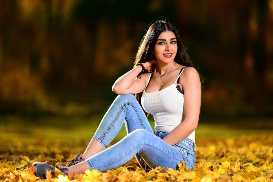 Wallpaper Smiling brunette sitting on fallen foliage