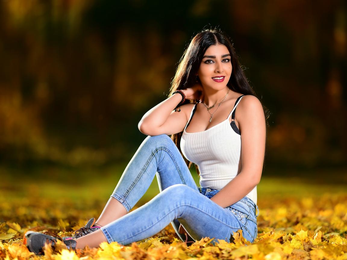 Wallpaper Smiling brunette sitting on fallen foliage