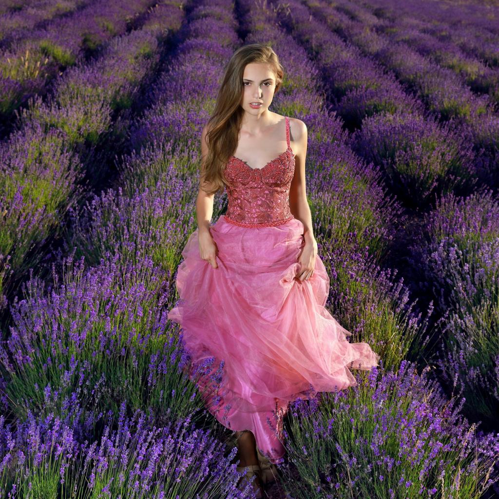 Wallpaper Beautiful girl in a pink dress on a lavender field