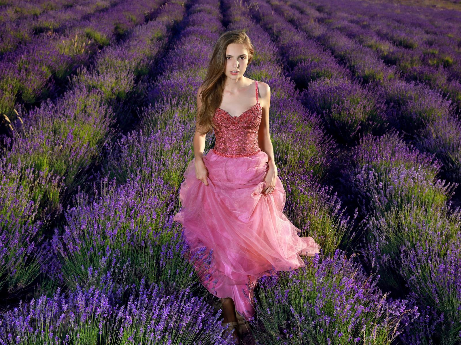 Wallpaper Beautiful girl in a pink dress on a lavender field