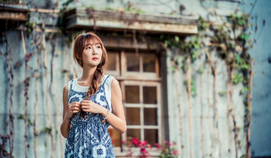 Wallpaper Beautiful Asian girl in a sundress near an old house