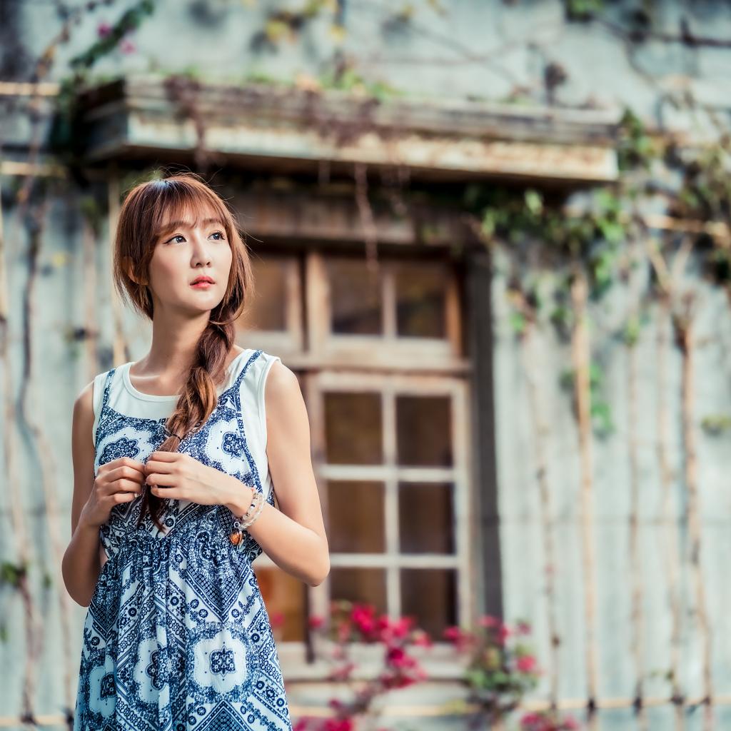 Wallpaper Beautiful Asian girl in a sundress near an old house