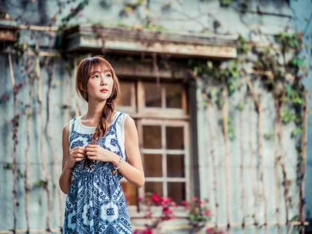 Wallpaper Beautiful Asian girl in a sundress near an old house