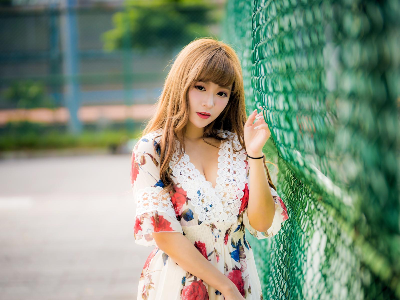 Wallpaper Young Asian girl in a dress near a green grid