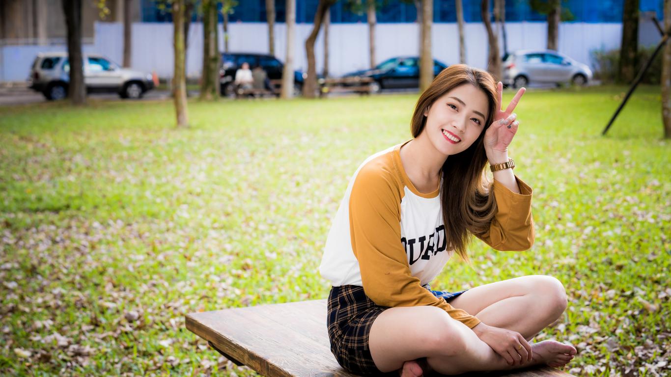 Wallpaper Smiling asian girl sitting on a bench in a park