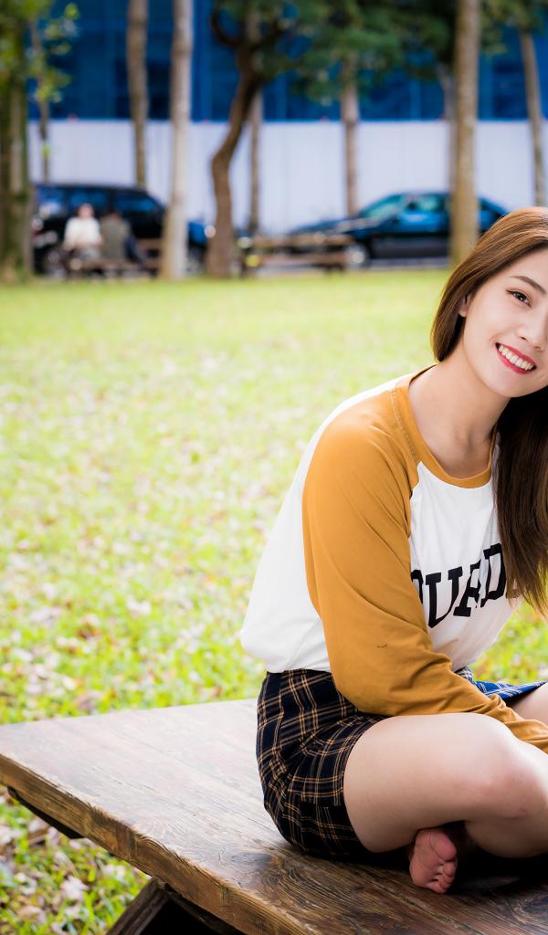 Wallpaper Smiling asian girl sitting on a bench in a park