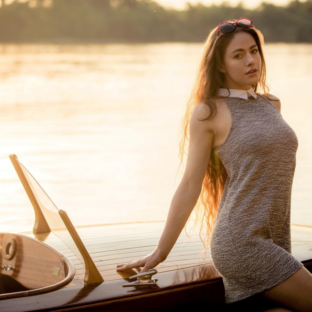 Wallpaper Beautiful girl in a short dress stands by the boat